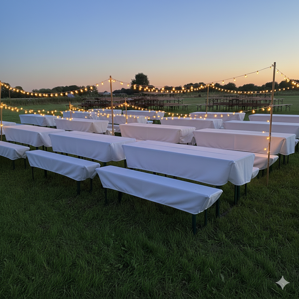 Unser Angebot umfasst den Hüpfburgverleih, wahlweise mit Aufbau, Abbau und Betreuung, sowie den Verleih von Zelten und Biertischgarnituren. Zusätzlich stellen wir Gläser, Teller, Besteck und Warmhaltebehälter für Speisen bereit. Für die richtige Atmosphäre sorgen wir mit Lichterketten und Stehtischen mit Hussen.